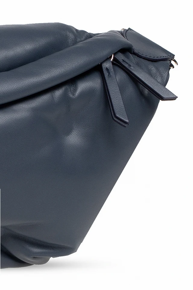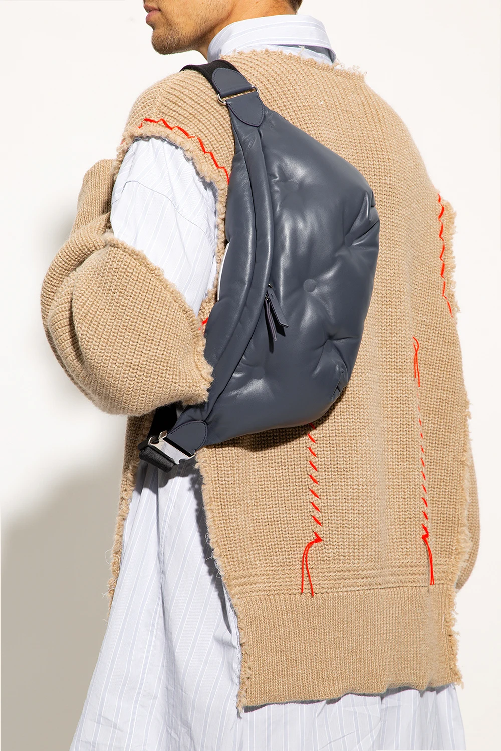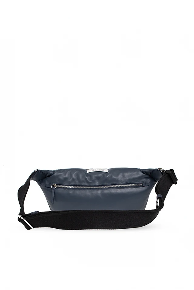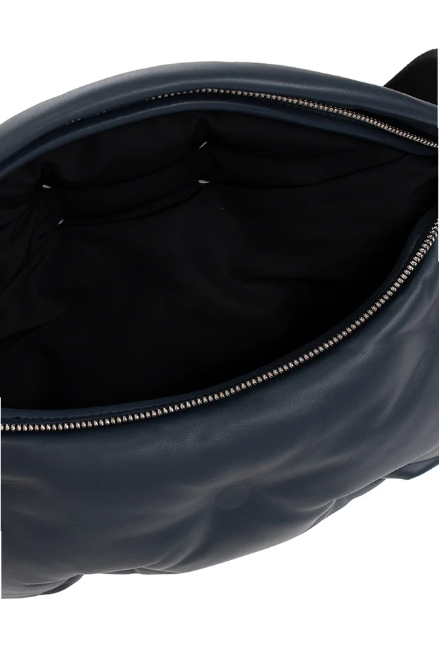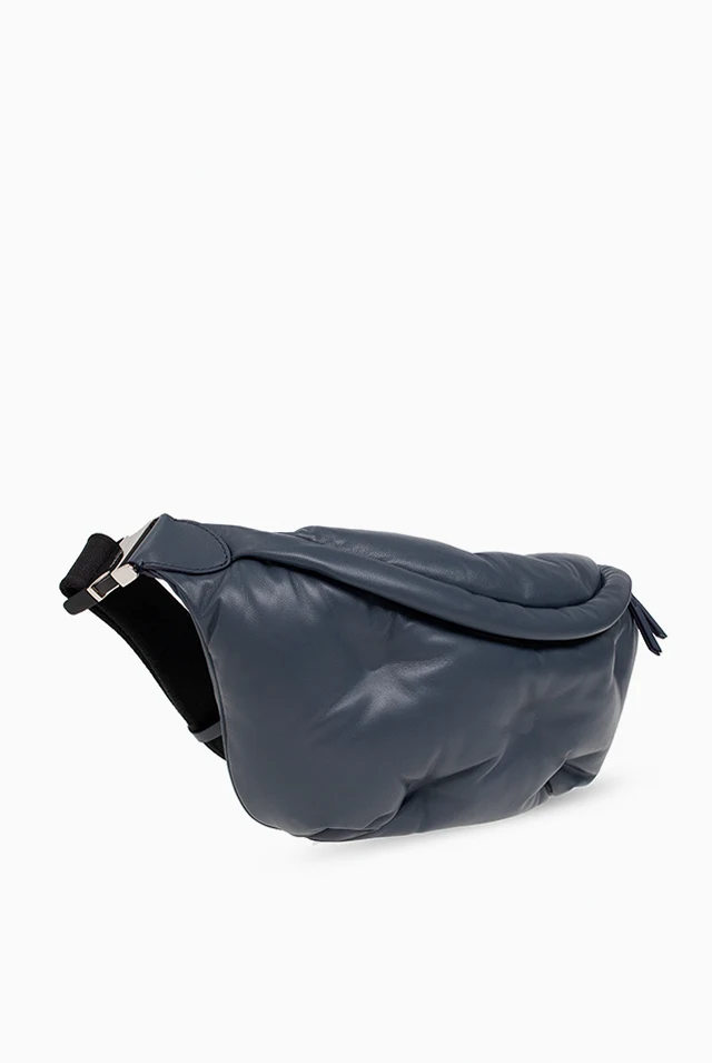 Niebieskoszara, pikowana torba na pas Maison Margiela. Wykonana z owczej skór. Zamykana na dwubiegunowy zamek. U góry ozdobiona białą naszywką z logo. Z tyłu kieszeń zamykana na zamek. Czarny, materiałowy pas na pas z możliwością regulacji długości. Wewnątrz komora i kieszeń zamykana na zamek. Metalowe elementy w kolorze srebrnym.
