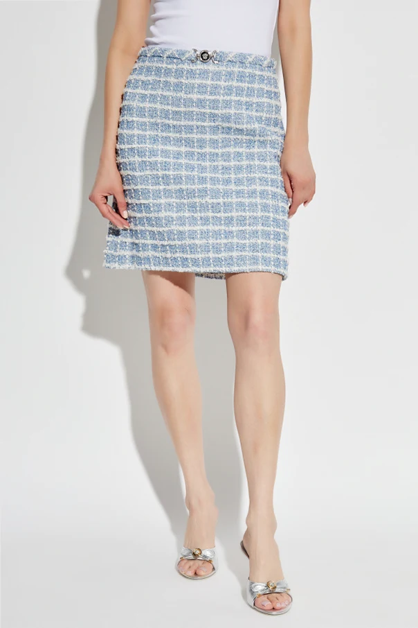 Odkryj niepowtarzalny urok, jaki kryje się w Tweedowej spódnicy z lureksową nicią od renomowanej marki Versace. Ta oszałamiająca kreacja łączy w sobie klasykę i nowoczesność za sprawą tweedowego materiału, który wzbogacono o subtelną lureksową nić, dodającą delikatnego połysku i elegancji .