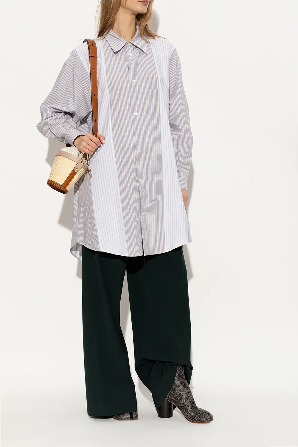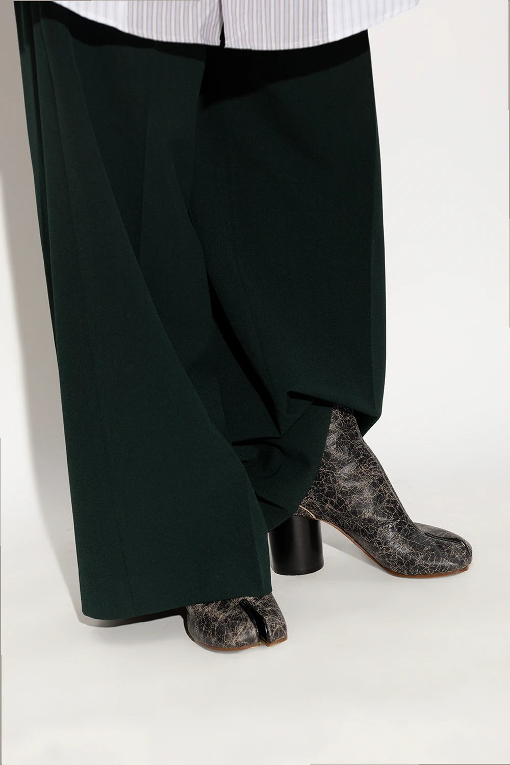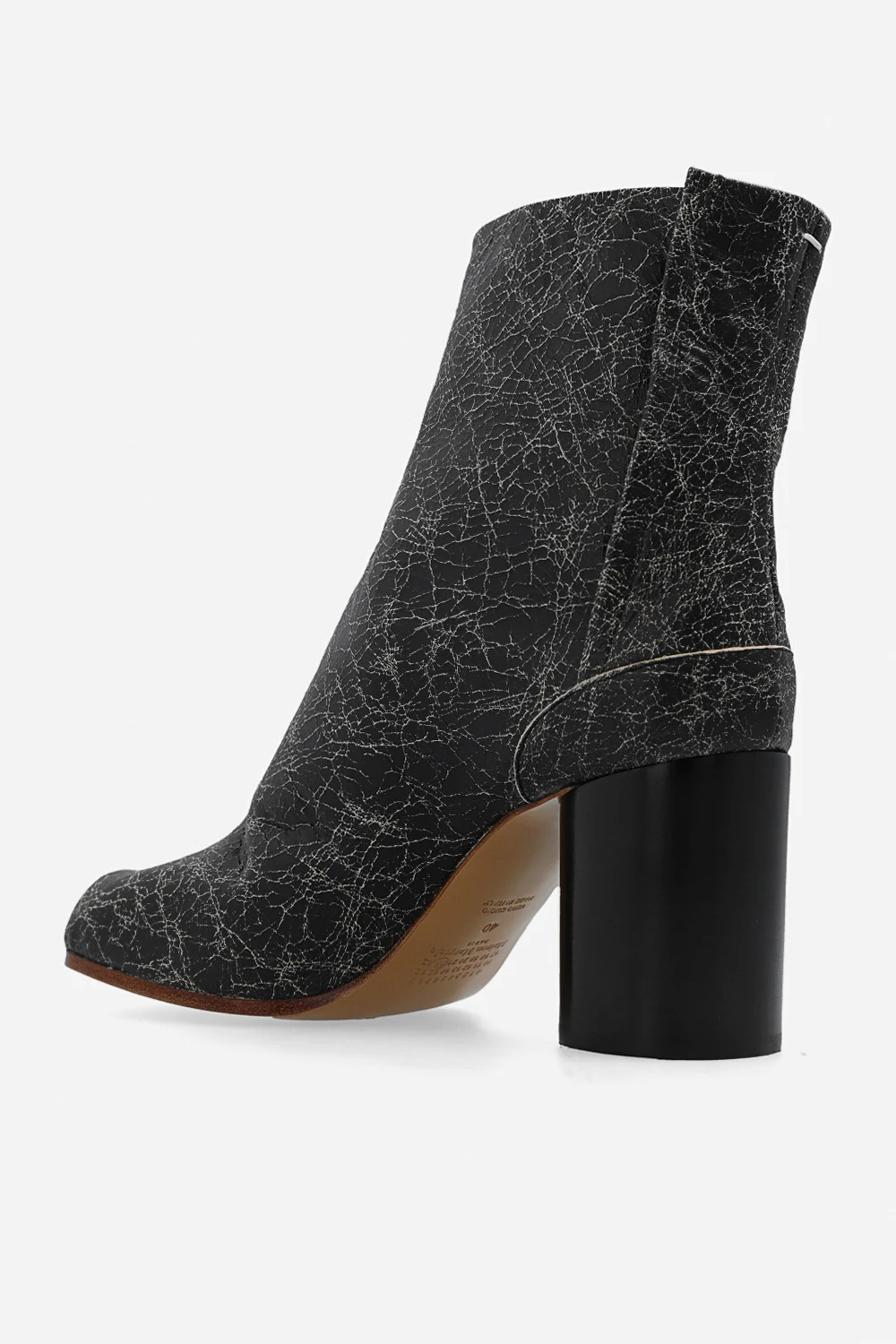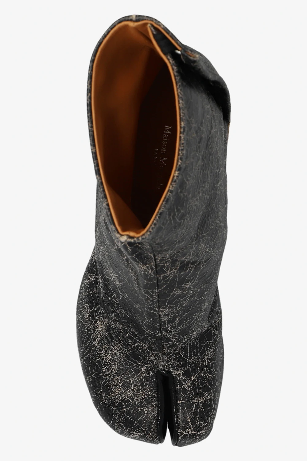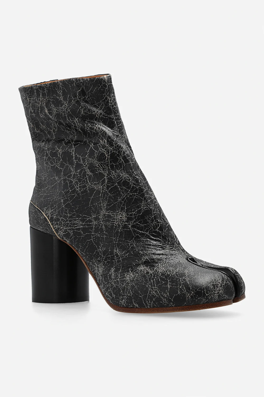 Brązowo-beżowe botki na obcasie, model ‘Tabi’ Maison Margiela. Wykonane ze skóry z efektem ‘vintage’. Z boku zapinane na zaczepy. Charakterystyczne wycięcie na palce ‘Tabi’. Beżowa, skórzana podeszwa.