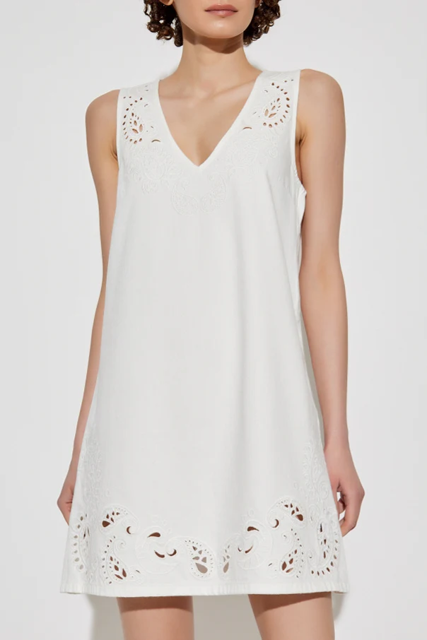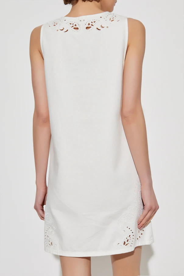 Sukienka ozdobiona jest delikatnym, ażurowym wzorem o motywach roślinnych, skoncentrowanym wokół dekoltu i dolnej części, co dodaje jej lekkości i niepowtarzalnej elegancji. Materiał, z przewagą naturalnych włókien, zapewnia przewiewność i komfort noszenia, idealny na letnie dni.