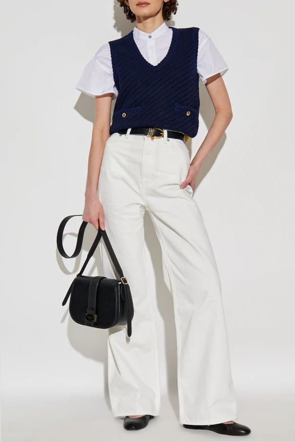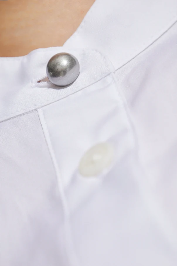 Top posiada krótkie rękawy i nowoczesną stójkę, zastępującą tradycyjny kołnierz. Uwagę przykuwa subtelny metaliczny guzik przy szyi, który stanowi niezwykły detal, podkreślający wyrafinowany charakter produktu. Projektanci zrezygnowali z widocznych logo i napisów, dzięki czemu top emanuje dyskretną elegancją.