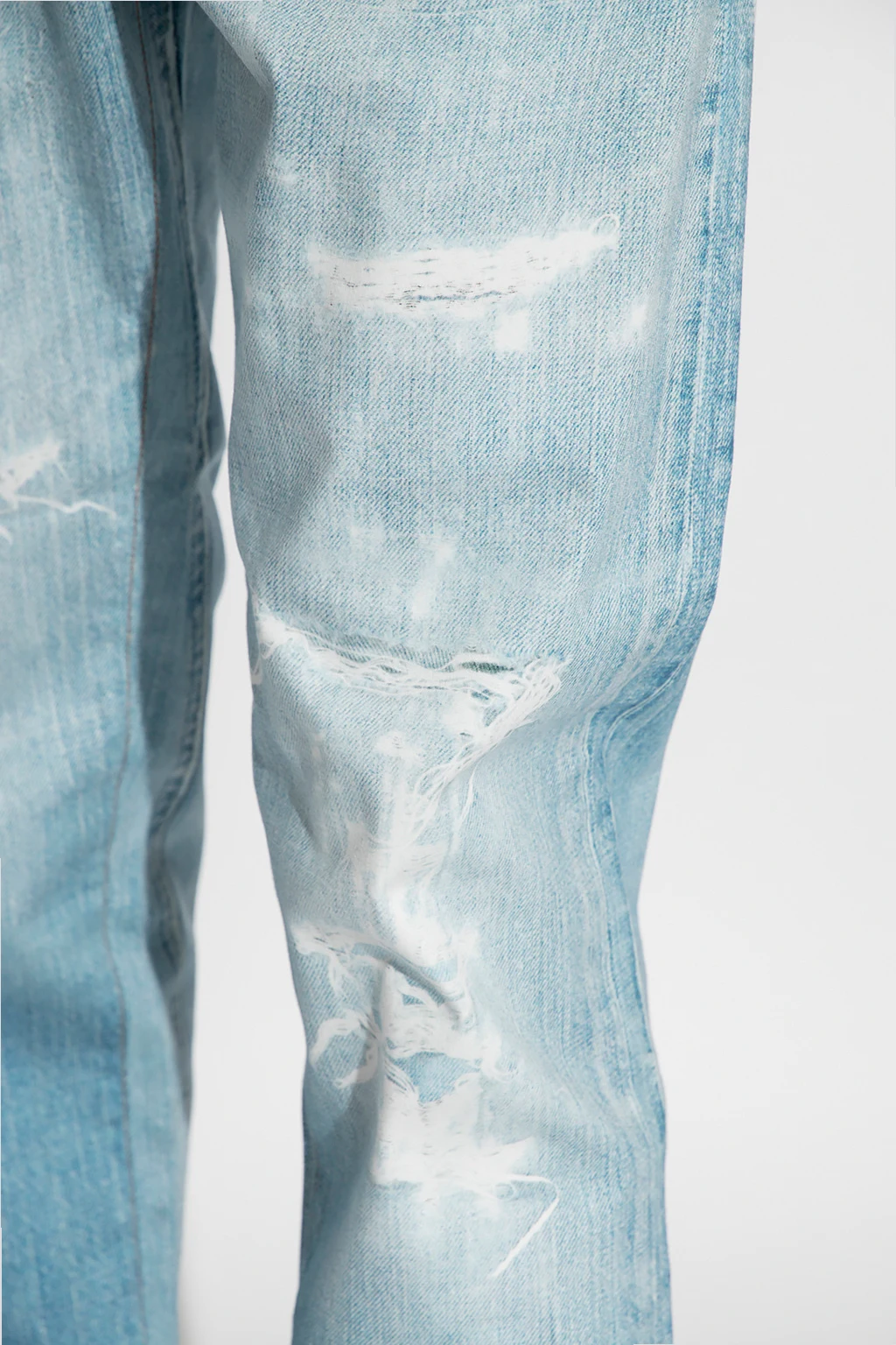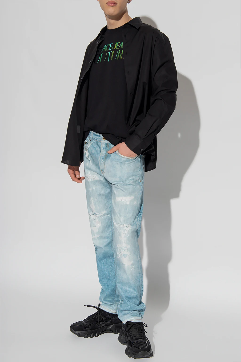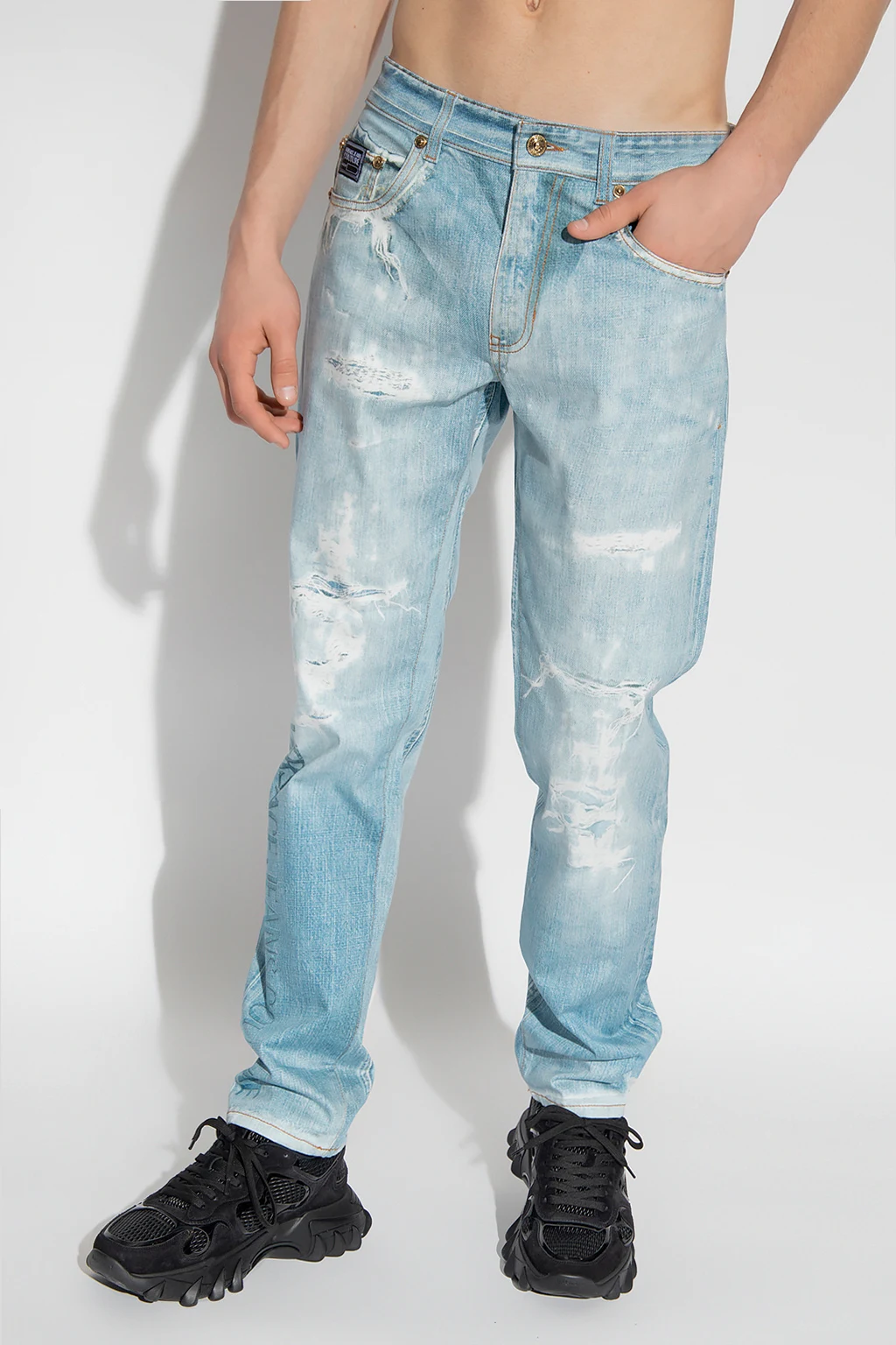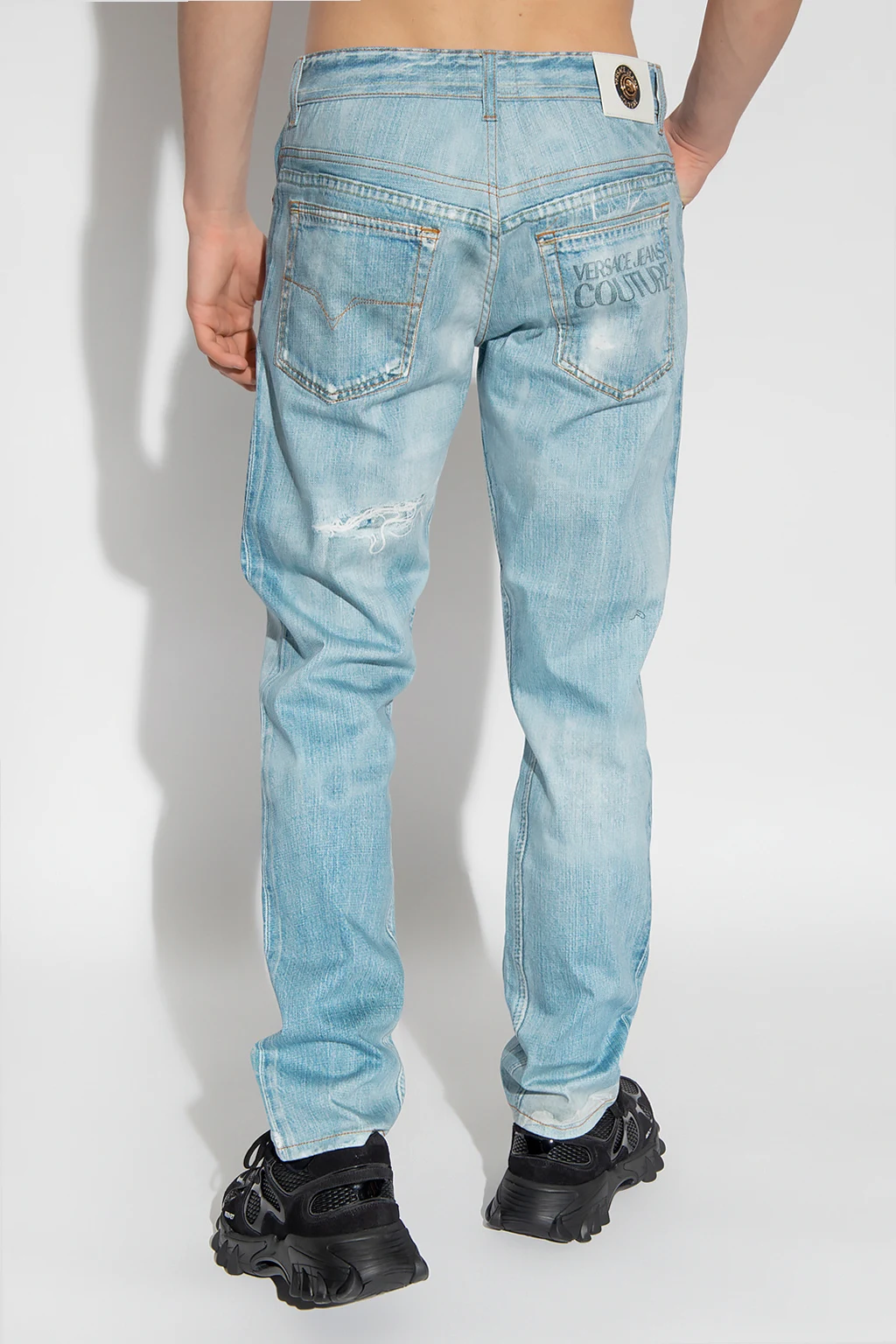 Niebieskie spodnie z efektem ‘trompe l’oeil’ Versace Jeans Couture. Wykonane z bawełny z nadrukiem imitującym jeans. Zapinane na guzik oraz zamek. Z przodu oraz z tyłu ozdobione naszywkami z logo. Pięć wsuwanych kieszeni. Długie, lekko zwężane nogawki z nadrukowanym logo.