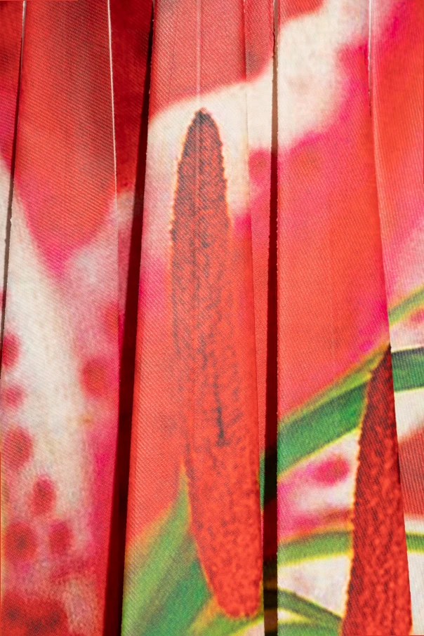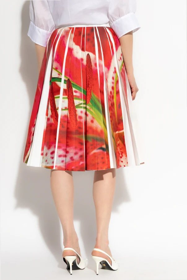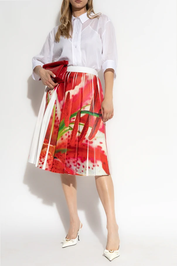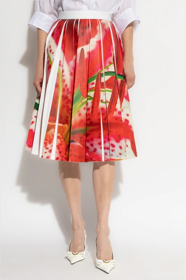 Spódnica o klasycznym plisowanym kroju, średniej długości, wykonana z lekkiej, zwiewnej tkaniny, jest prawdziwą ucztą dla oczu. Głównym atutem jest wyrazisty, kolorowy nadruk z motywem kwiatowym, w którym dominuje odcień czerwieni z subtelnymi zielonymi i białymi akcentami.
