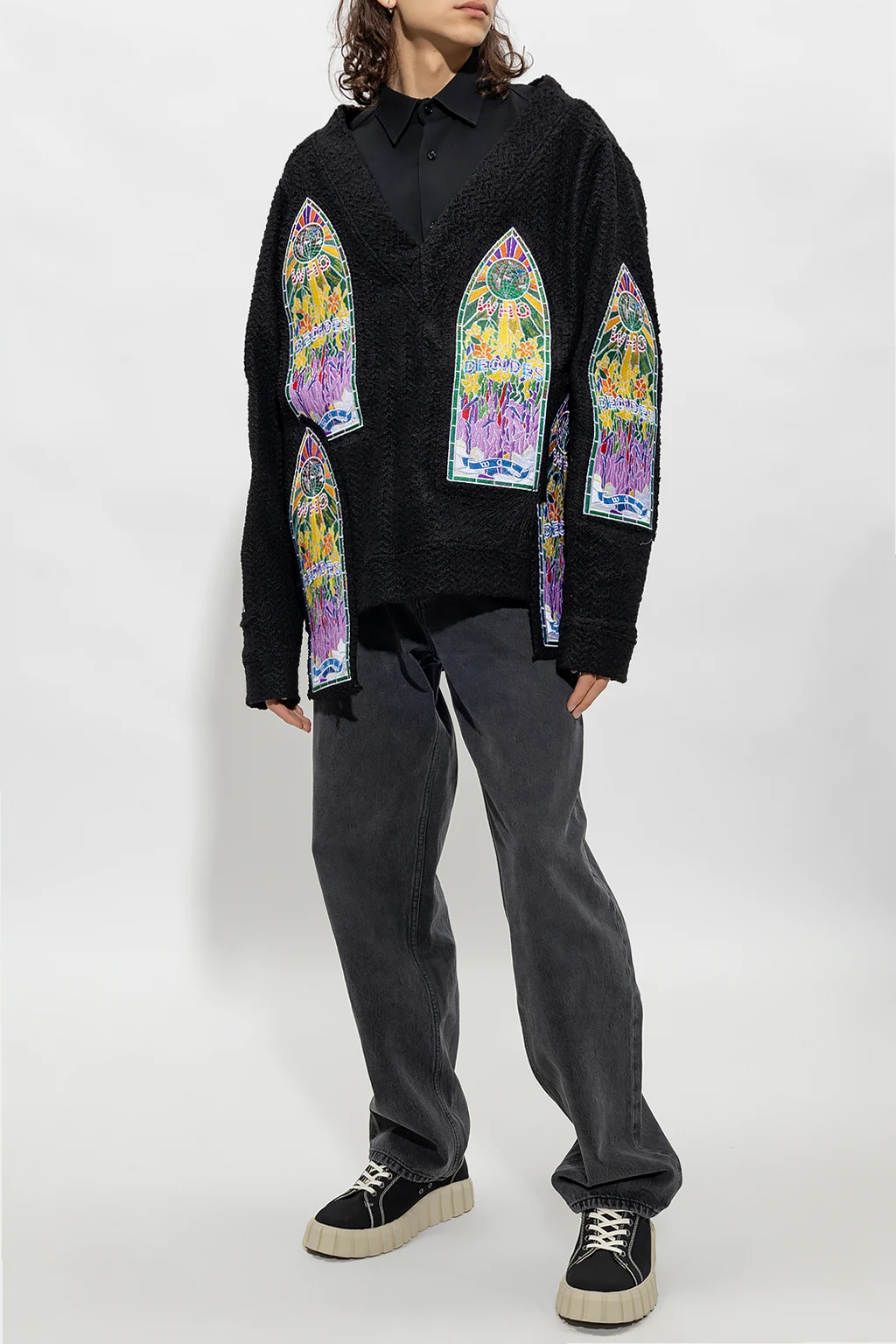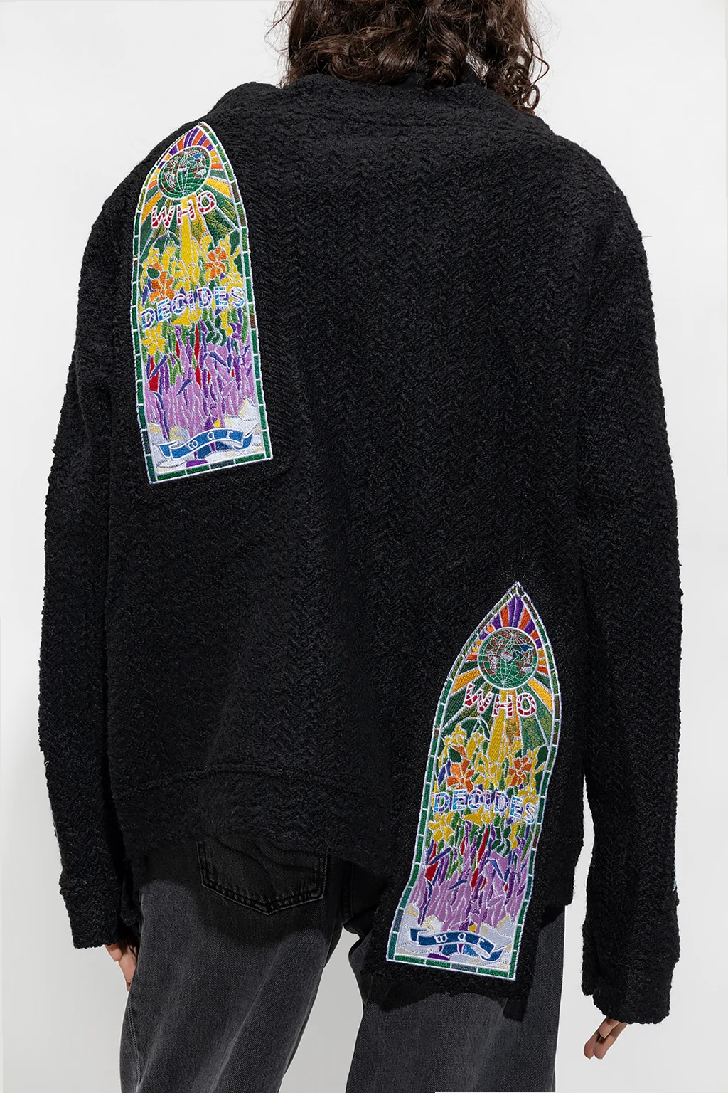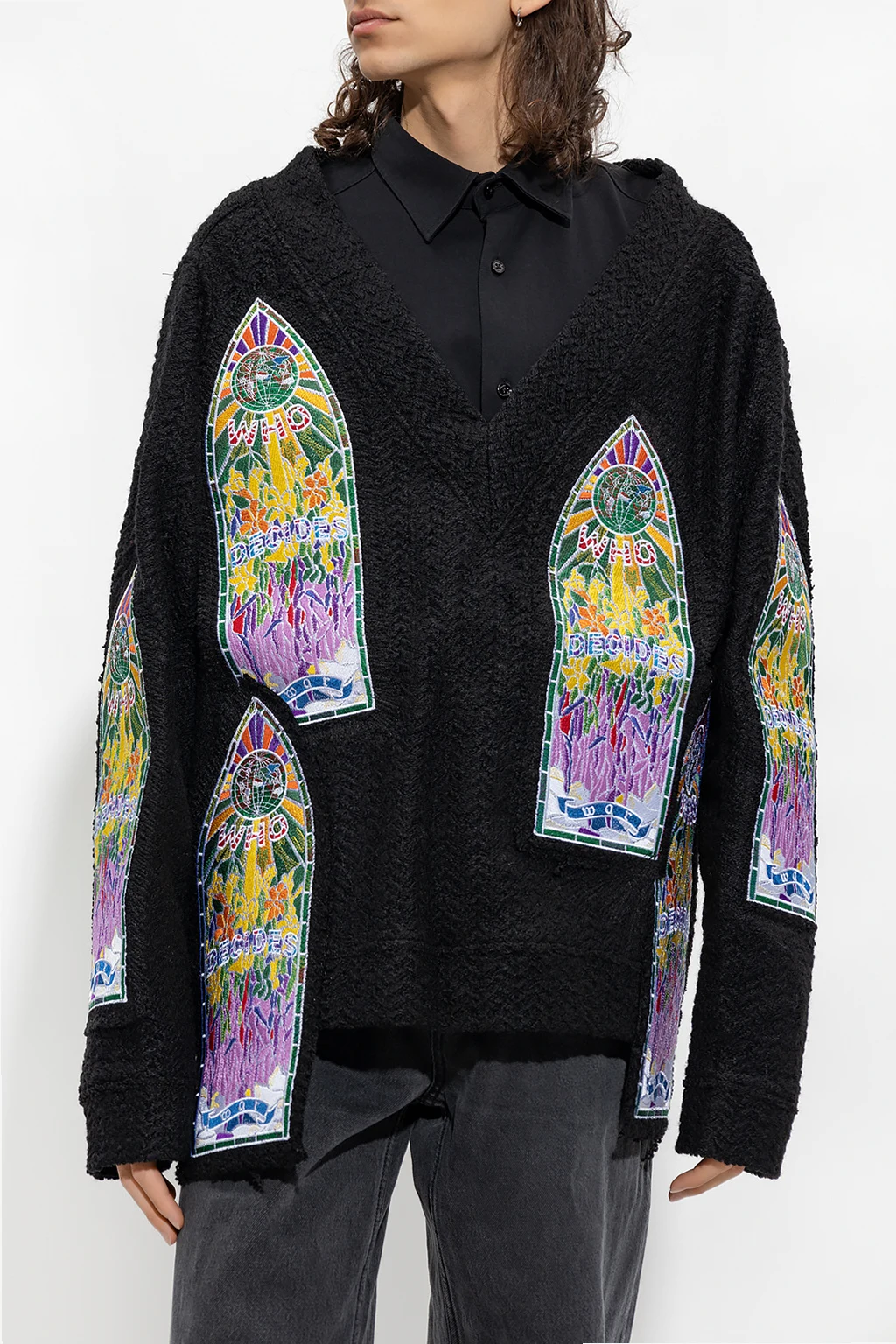 Czarny sweter Who Decides War. Ozdobiony kolorowymi naszywkami z motywem logo, inspirowanymi witrażami. Dekolt w serek, długie rękawy oraz dół wykończone ściągaczem. Asymetryczny dół.