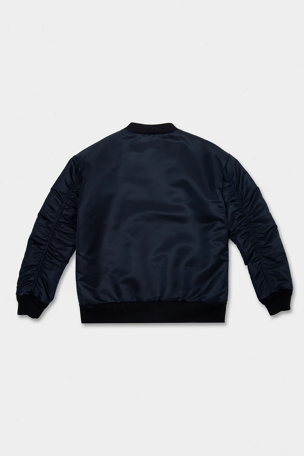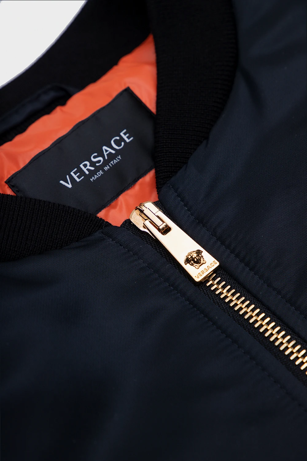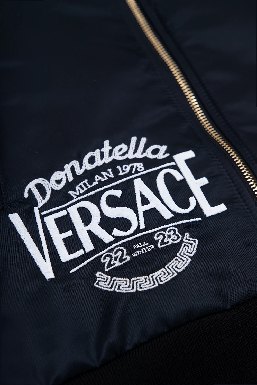 Czarna, ocieplana kurtka typu ‘bomber’ Versace Kids. Zapinana na zamek. Ozdobiona wyszytym wzorem z logo w kolorze białym. Trzy kieszenie: dwie wsuwane i zapinana na zamek. Dekolt, dekoracyjnie marszczone, długie rękawy i dół zakończone ściągaczem.
